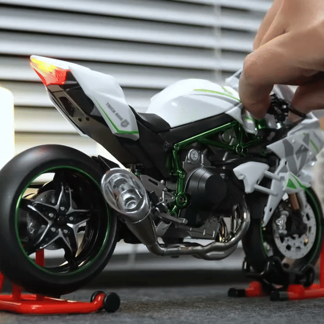 Key Start + Linked Transmission: Insert the key and twist the throttle to "start" the model. The rear wheel spins in sync, perfectly simulating the power transmission of a real Kawasaki H2R for an immersive riding feel.